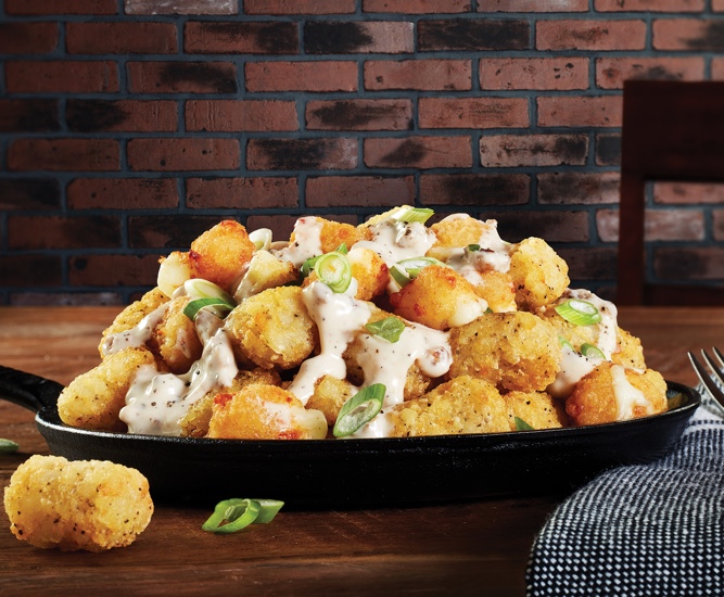 Crispy Sea Salt & Black Pepper seasoned tots topped with real Wisconsin cheese curds, chopped green onions and drizzled with savory, authentic white sausage gravy.