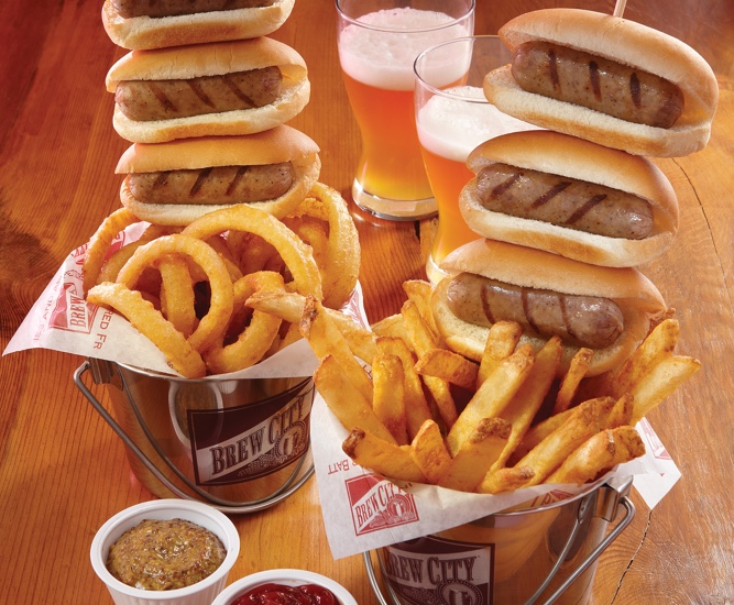 Beer battered fries and thin-cut onion rings served with a share-worthy stack of stadium brats.