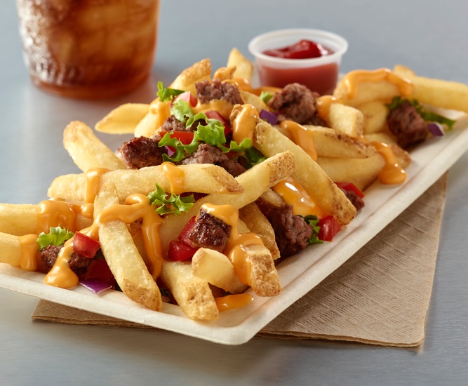 Crispy classic-cut fries layered with traditional burger ingredients like chopped hamburger, lettuce, tomatoes, cheddar cheese and special sauce.
