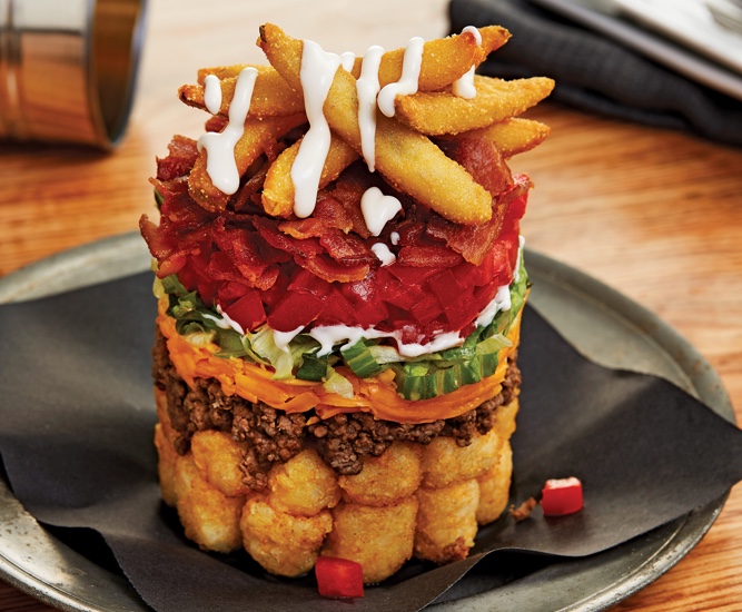 Colossal flavors collide in this tower layered with tasty Mexican nacho toppings and American masterpieces like crumbled bacon, crispy Ore-Ida® Tater Tots® and Anchor® Spicy Pickle Fries.