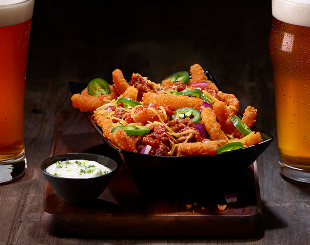 Crispy onion straws topped with meaty chili, cheddar cheese, chopped tomatoes, red onions and sliced jalapeños—finished with citrus sour cream.
