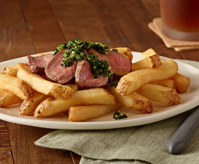 Steak Fries get an Argentinean overhaul when loaded with tender strips of sirloin steak and drizzled with authentic Chimichurri sauce.