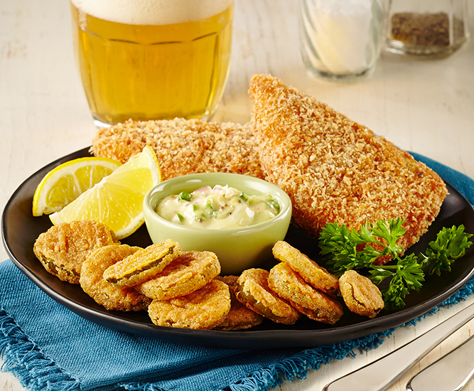 Heat things up with two spicy whitefish filets alongside zesty, hot pickle chips and a cool, creamy remoulade dipping sauce.