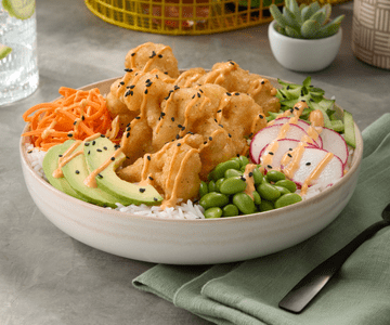 Top basmati rice with bang bang CAULI W’NGZ. Sprinkle on black sesame seeds. Pile on sliced avocado, cucumbers, shredded carrots, pickled radish and edamame, then drizzle with more bang bang sauce.
