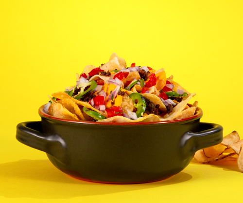 Thin-cut, fresh-fried potato chips topped with seasoned ground beef, queso, blistered jalapeño slices, onions, tomatoes, cilantro and sour cream