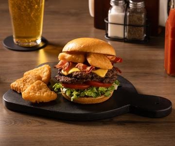 Anchor® Mac & Cheese Wedges accompany a smashed burger patty topped with bacon on a sweet Hawaiian bun.