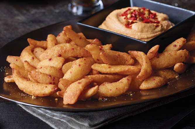 Enjoy the crispy sweetness of craft beer-battered onion petals dusted with cumin and garlic salt and served with hand-mashed Harissa Hummus.