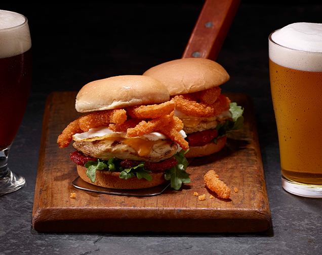 Two grilled chicken sliders topped with oven-dried tomatoes, fresh arugula, aged Cheddar cheese and finished with spicy breaded onion straws and a fried egg.