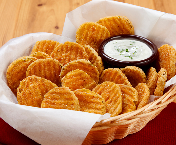 Crinkle-cut dill pickle chips coated in a light breading with a hint of spice and cool ranch dip.