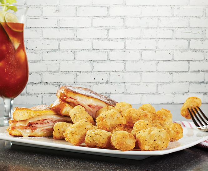 McCain Sea Salt & Black Pepper Seasoned Tots upgrade the expected hash brown side to this Monte Cristo sandwich, with raspberry jam for dipping.