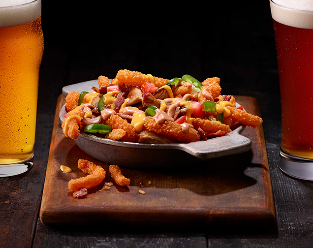 A tangle of crispy onion straws topped with tender pulled pork, crumbled bacon, sliced jalapeños and tomatoes—drizzled with creamy cheddar cheese sauce and BBQ mayo.